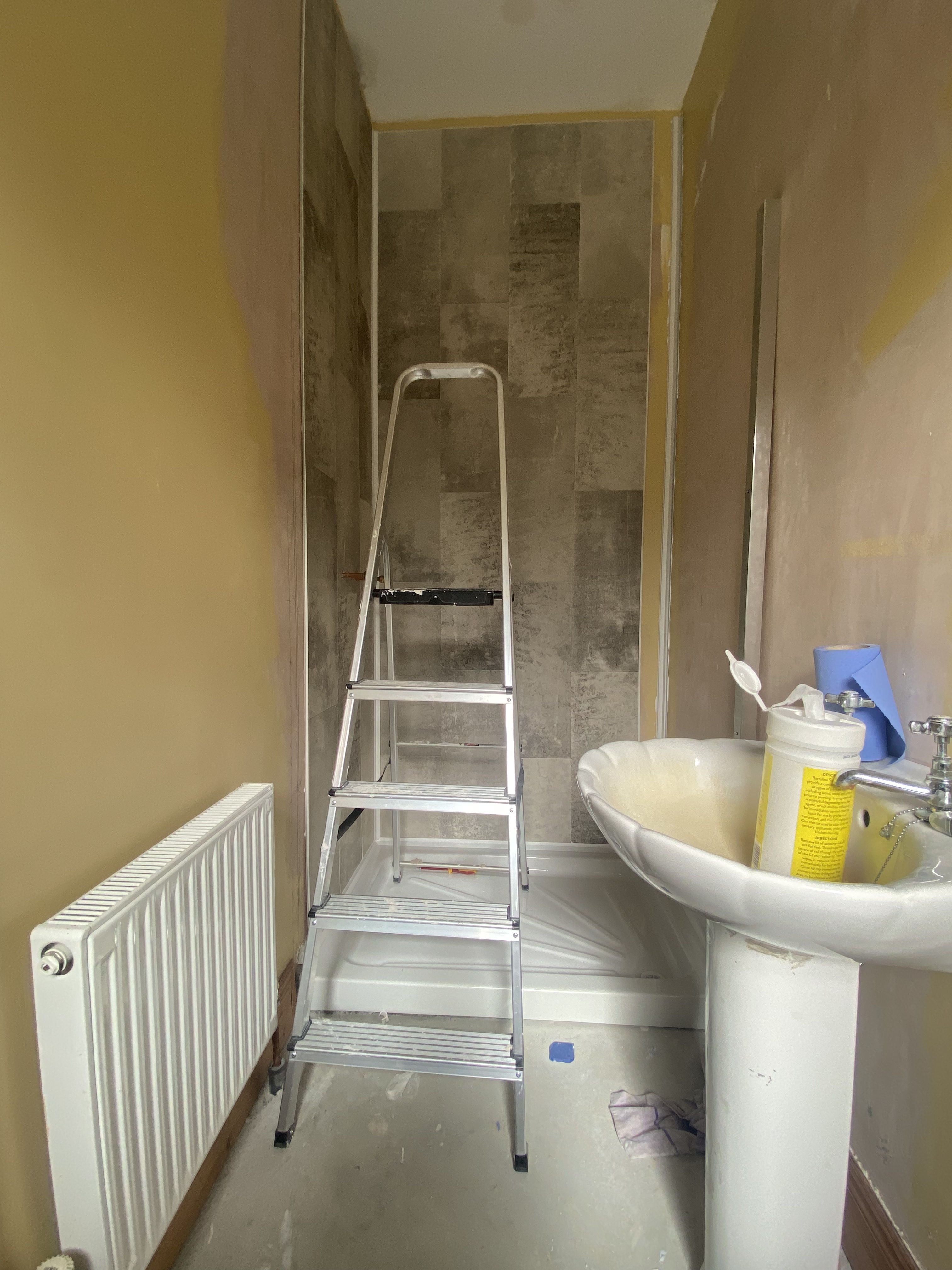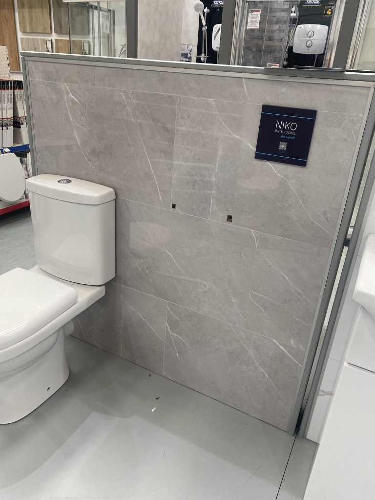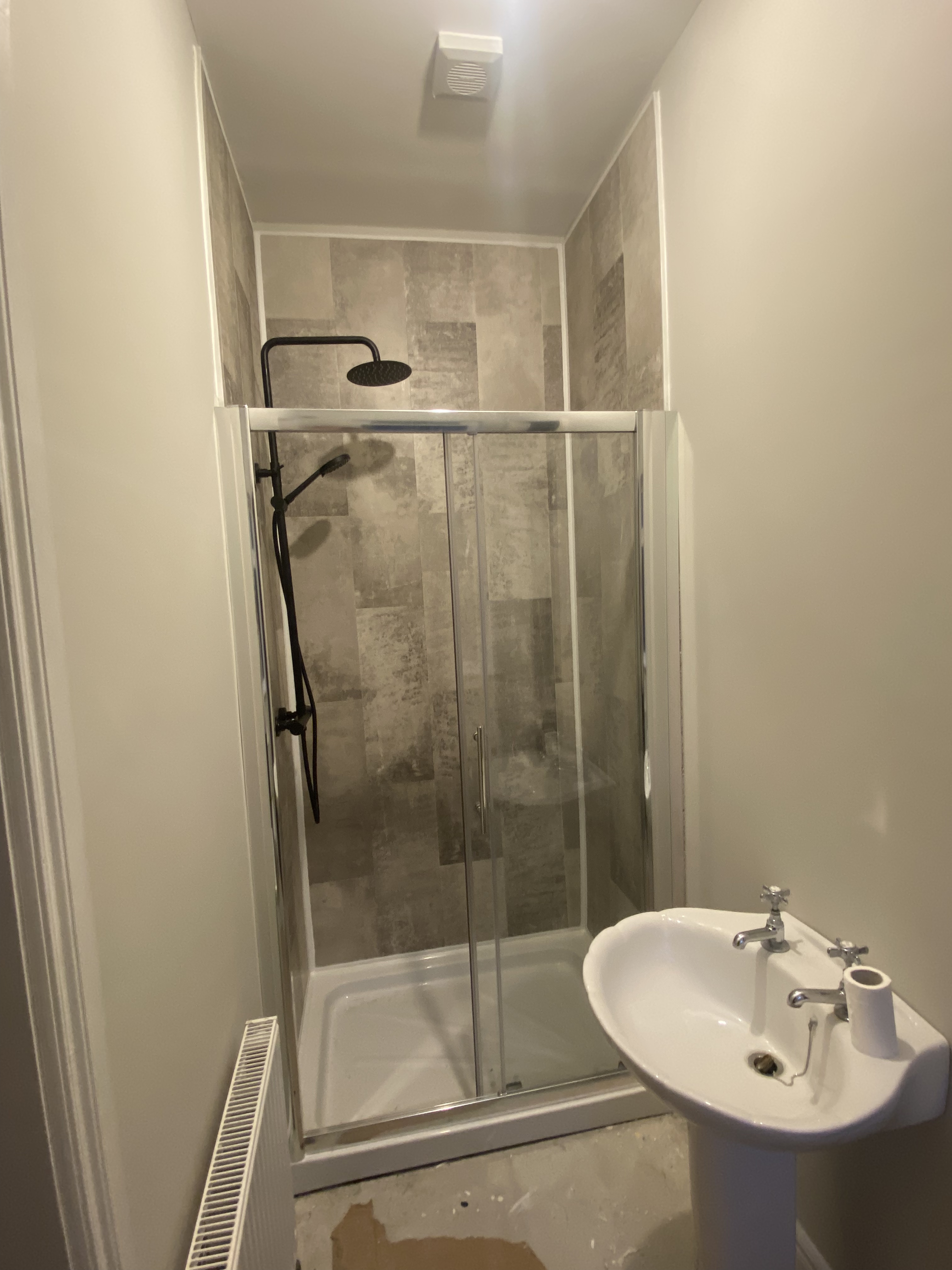 We spent time researching what finishes we wanted. Originally we wanted to go with tiles in just the shower surround. However, we contacted a number of tilers who just weren’t available in the timeframe we needed. We lived in Edinburgh briefly in 2014 & had a PVC panelled bathroom. It definitely wasn’t our first choice. But we were pleasantly surprised at the options now available, especially the non shiny choices. We also saved a lot of money here as Martin was able to install it with the help of family & friends. It is a click system that is glued to the wall. It does get a bit tricky in the corners & will require cutting to your measurements. It is finished with the usual PVC caps used for tiles. The only downfall here is the only option available in a lot of the brands this is white, where we would have preferred chrome or a similar colour to the panels we picked. There is also a lifespan on these panels so that is definitely something to bare in mind when choosing this option.