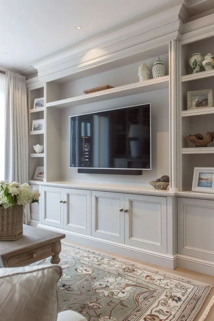 I truly love the above example. If we had this type of layout I think I would good with this style. However, we have double doors to one side, a fireplace and then a vast recessed space on the other side. This recessed space is where our media wall will go but at the moment we are trying to decide what design to go with. We have the TV mounted there, would like a tidy fuel store for the fire and descent storage that will match in with the proposed mini library. Not a tall order at all!